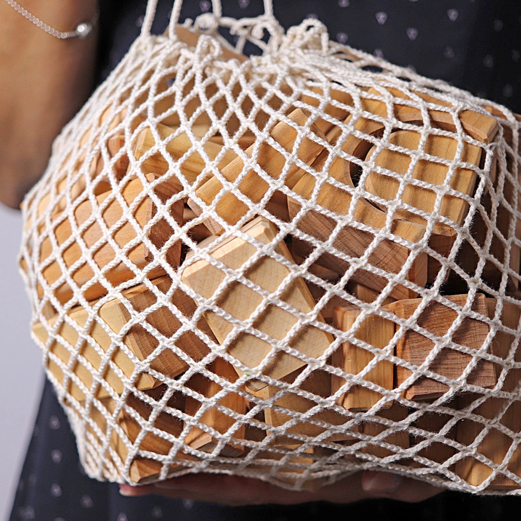 Our Natural Geo-Blocks are an absolute basic equipment for creative building. With different shapes and sizes, the building blocks are extremely versatile and the possibilities are endless. The typical GRIMM'S surface allows even beginners to enjoy their first successes. Bundled together in a fabric net, they are also easy for children to find and keep within easy reach on the shelf. 60 classic geometrical building blocks in a net bag.