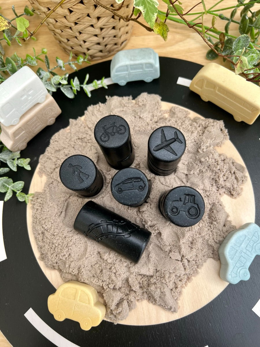 De set bevat: trein & spoorlijn, auto en twee sporen, fiets en enkel spoor, vliegtuig & condensstrepen, tractor & twee sporen, en voetganger & voetafdrukken. Gemaakt van een duurzame stenen mix, bevat elke set zes rollers van elk 72 x 34 mm en zijn ze gemakkelijk schoon te maken. Leeftijd 2+.