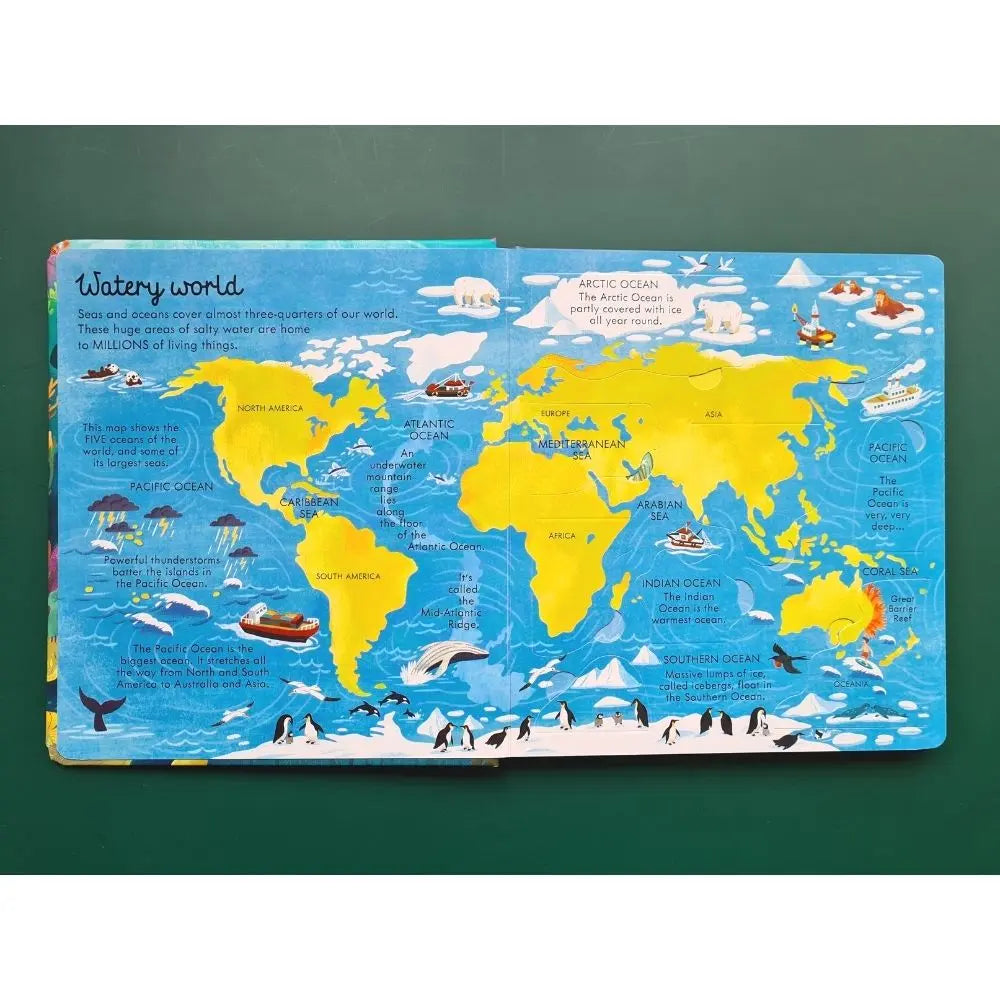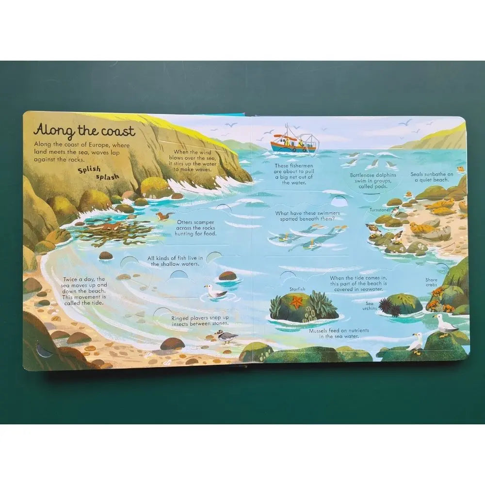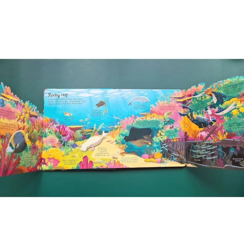 Open de flappen van dit boek en duik in een waterrijke wereld vol verbazingwekkende wezens. Verken kusten, koraalriffen en mangrovebossen, en ontdek wat er leeft in het diepste, donkerste deel van de oceaan.