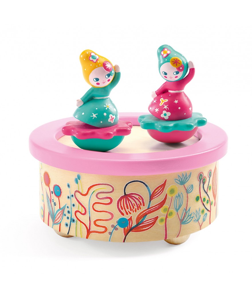 Deze kostbare muziekdoos speelt Schubert's wiegelied, terwijl de zoete magnetische vos en zijn vriend heel snel rond en rond dansen. Materiaal: Hout, Metaal, Kunststof.