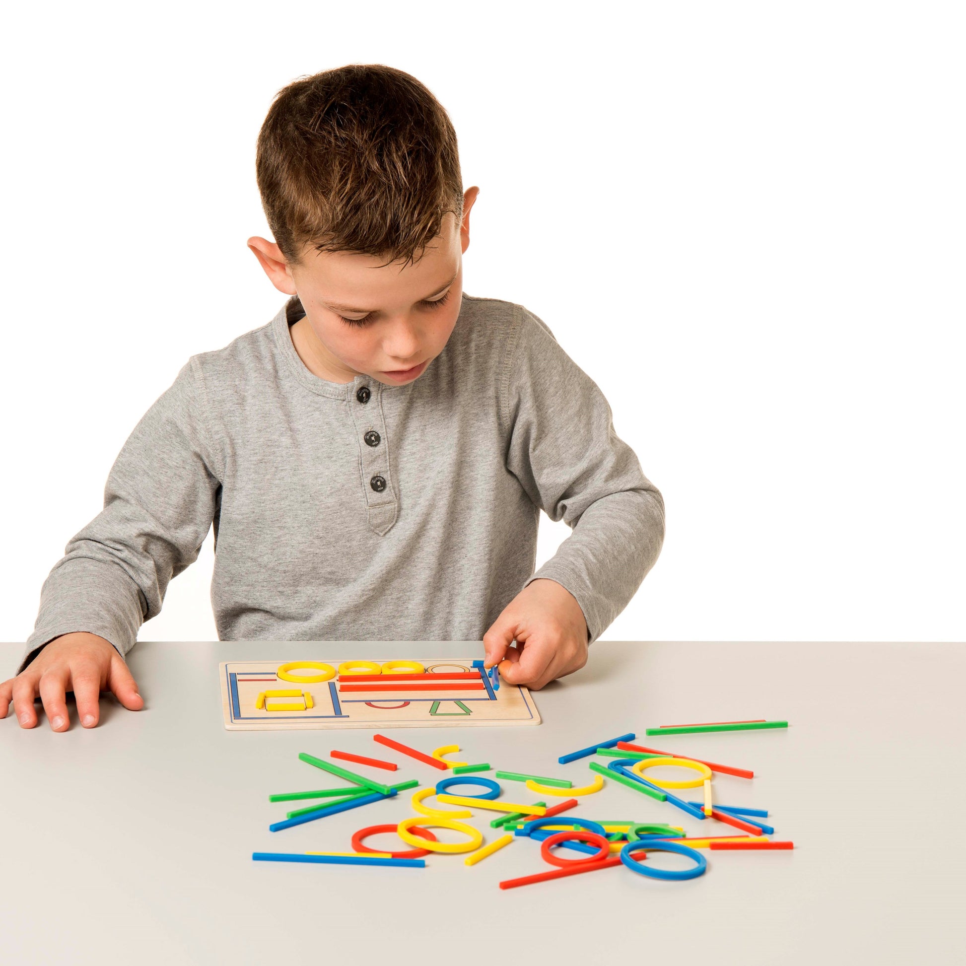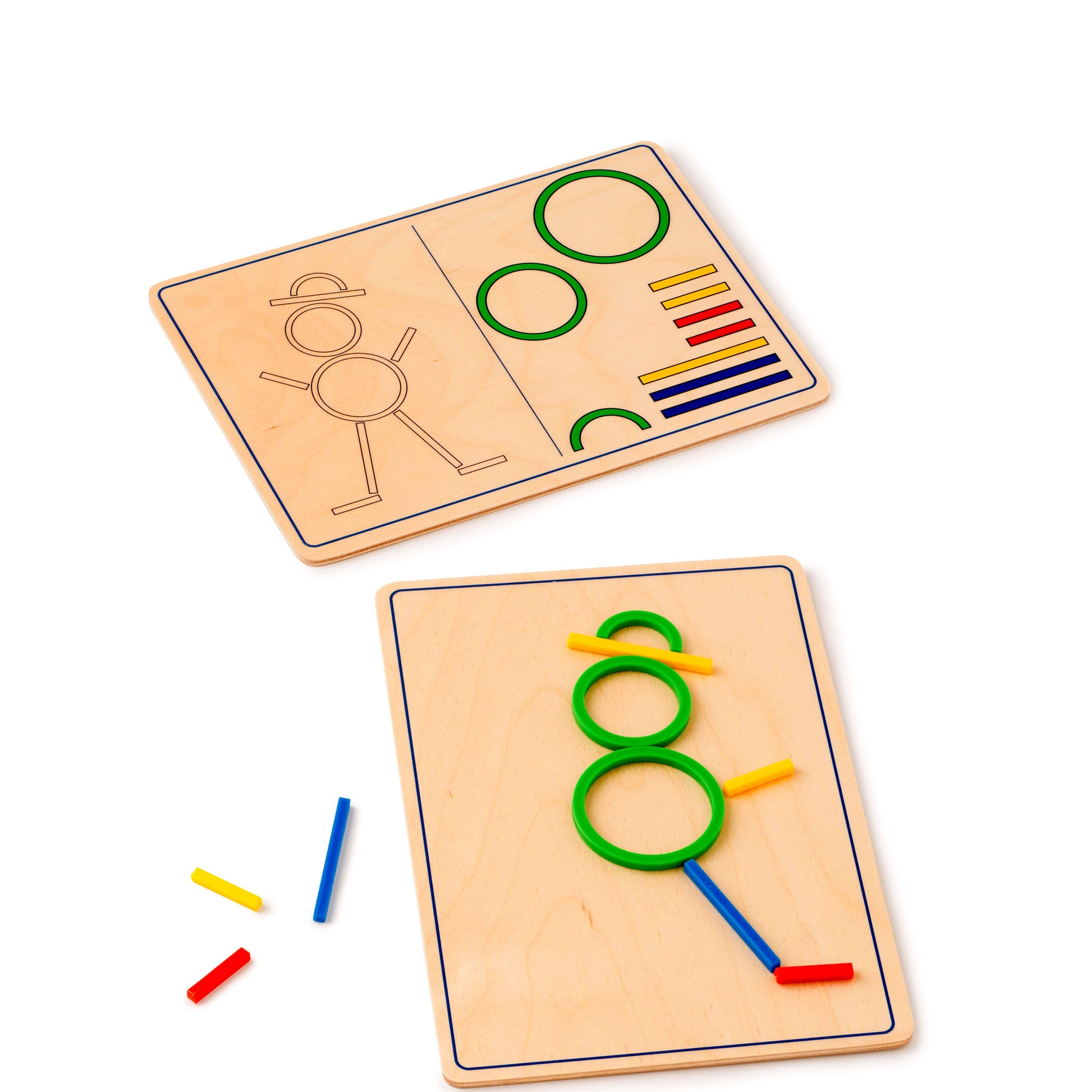 Maak de figuren van de opdrachtkaarten met de ringen en stokken of maak je eigen. Vergelijk verschillende kleuren en maten. Stimuleer de fijne motoriek en visuele analyse.