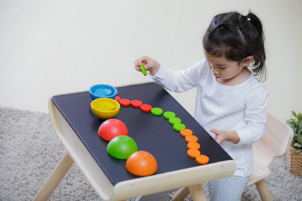 Kinderen kunnen leren sorteren en tellen met dit eenvoudige ontwerp dat op verschillende manieren kan worden gespeeld. Speelinstructies en een katoenen tas zijn inbegrepen.