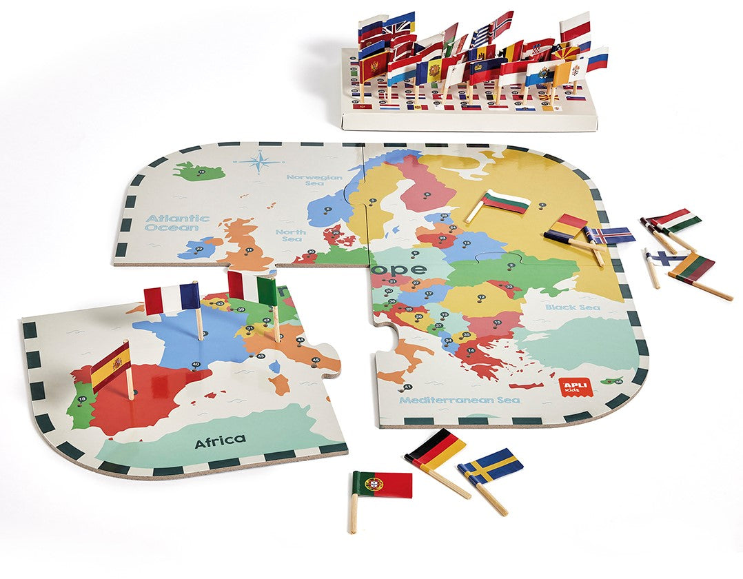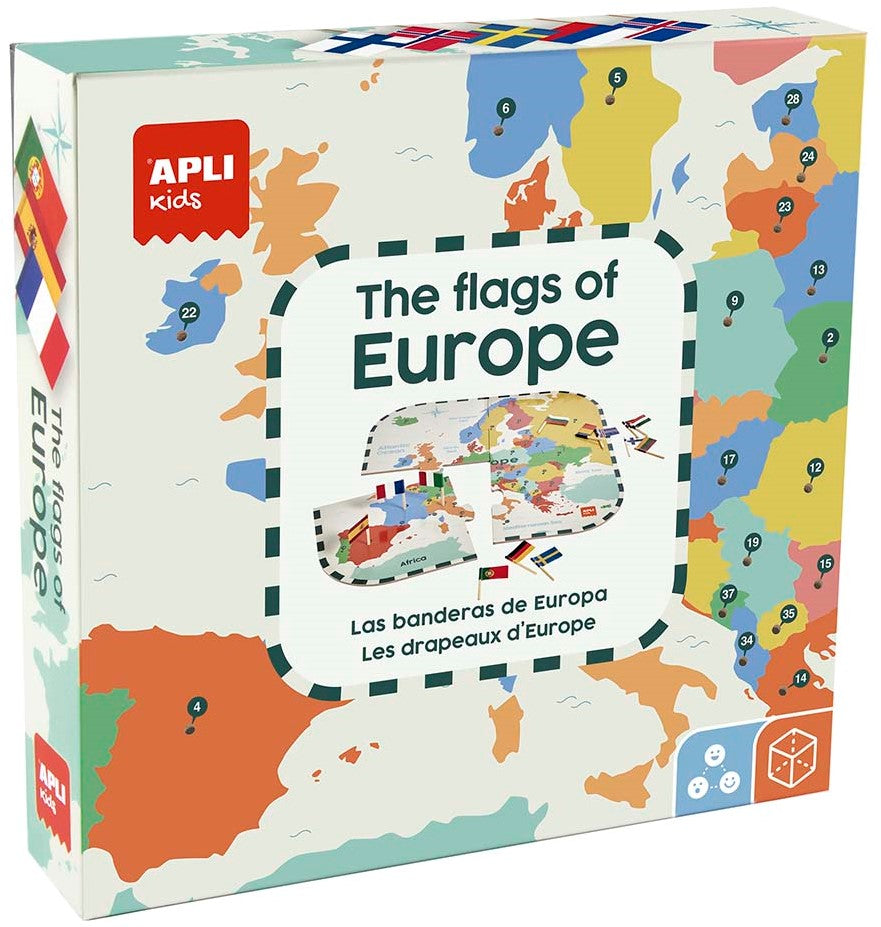 Puzzel Vlaggen van Europa – een leuke manier om geografie te leren: identificeer de vlag, plaats deze op het bijbehorende land, en de speler die de meeste landen correct raadt, wint. Inclusief 1 bord met een kaart van Europa, 45 vlaggen van verschillende landen, en 1 verklarend boekje met elke vlag en belangrijke informatie over het land in 10 verschillende talen: landnaam, oppervlakte, bevolking, hoofdstad, valuta, en talen.
