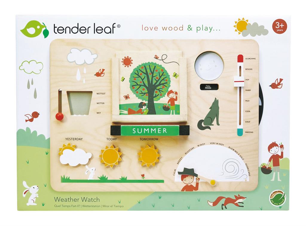 Draai aan het wiel om de 8 fasen van de maan en hun namen te zien, beweeg de temperatuurband om de temperatuur te laten stijgen en dalen, til de hoed van het jongetje op om te laten zien hoe winderig het is, en beweeg de hendel op en neer in de emmer om te laten zien hoe hoog de neerslag is. Veilig opgeborgen in een bedrukte trekkoordtas zijn er 9 weersymbolen om magnetisch te plaatsen op de weersvoorspellingen van gisteren, vandaag en morgen.