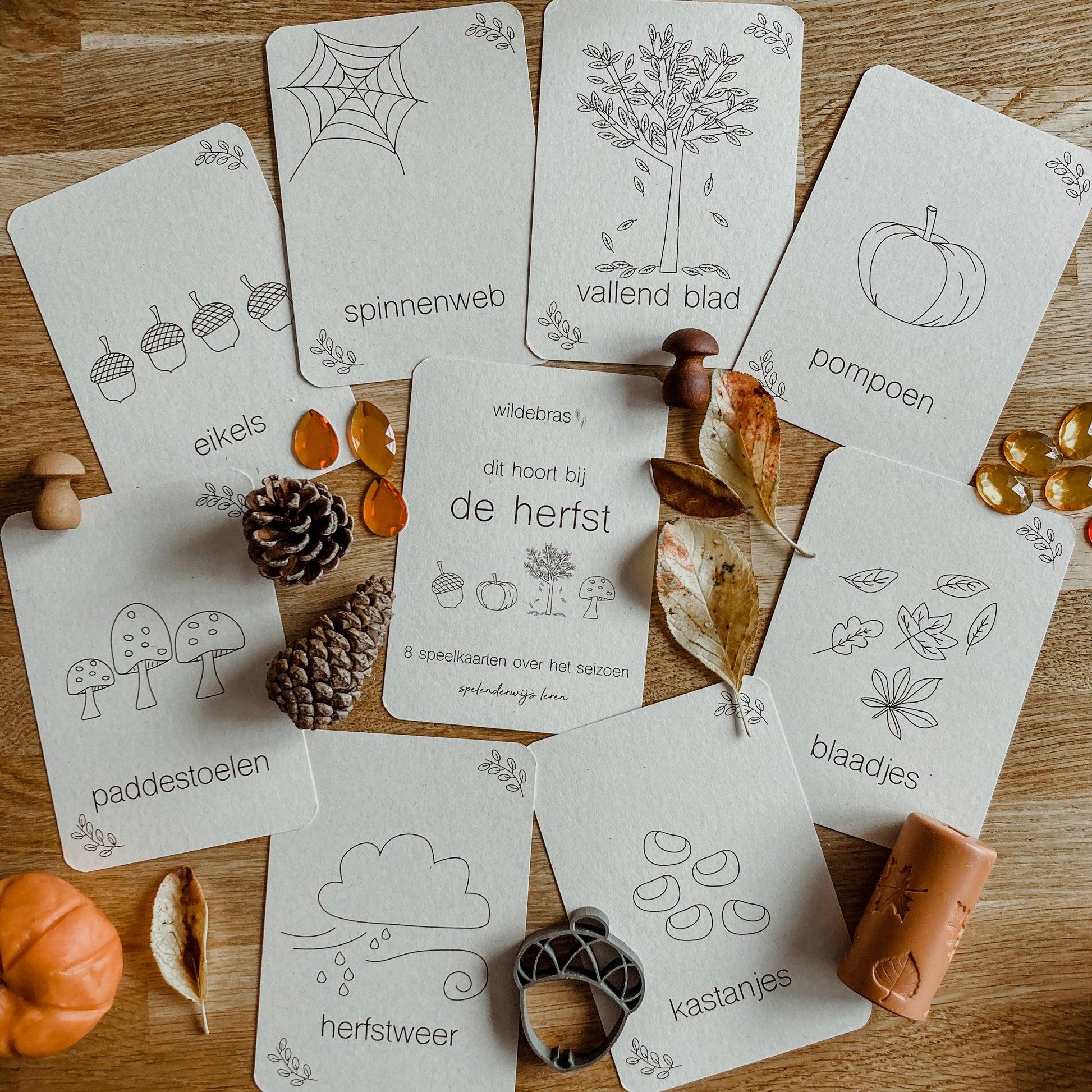 The autumn flashcard set consists of 8 double-sided printed cards in A6 format. On one side is an image that belongs to autumn. On the other side there is a shape that is useful for playing, such as filling in a shape with play rice or to follow with a finger or brush.