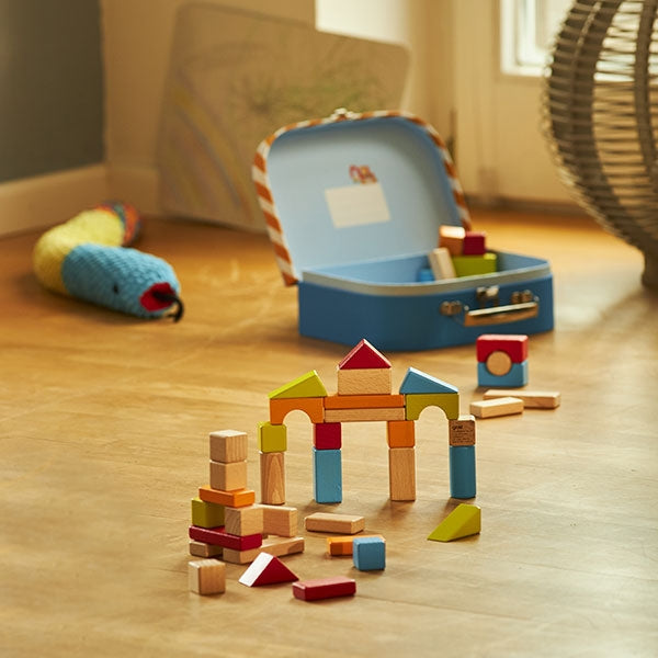 The goki building block case. A suitcase full of building blocks - what more does the "little builder" need to be happy? It is precisely the mixture of coloured and natural