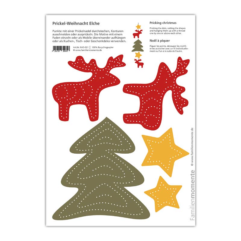 Pricking is not only fun but also promotes fine motor skills, concentration, and hand-eye coordination. Simply pierce the pre-printed dots with the pricking needle and decorative motifs for mobiles, table decorations, or many other decoration ideas are created. The pricking craft sheet in DIN A5 is made of 300 g/m² recycled paper and is printed in color on both sides.
