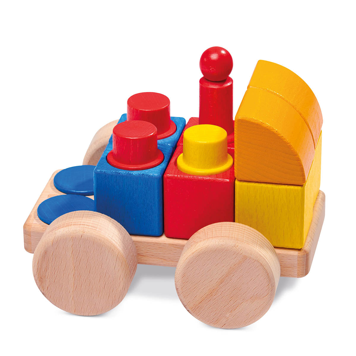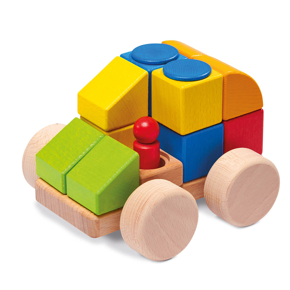 Large cubio car to plug in. With a sturdy base made of beech wood, wooden wheels connected to steel axles and 29 wooden plug-in parts.