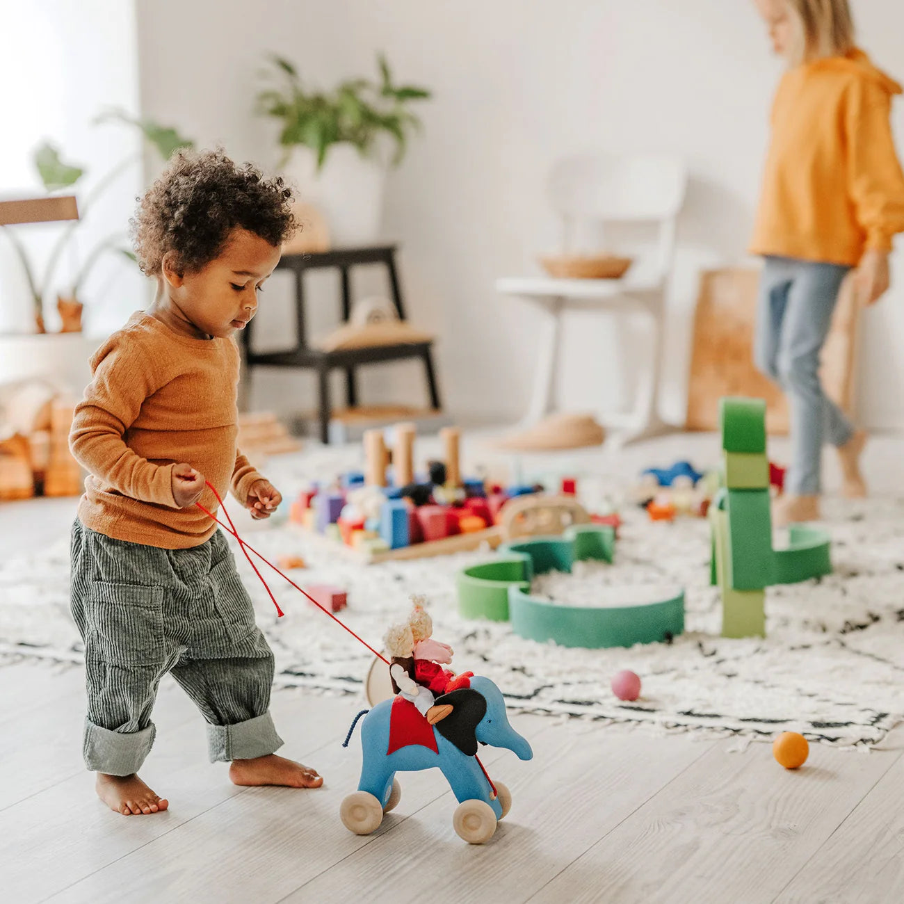 If children have learned to walk, they like to pull something behind them. Otto, the blue Elephant is a great companion!