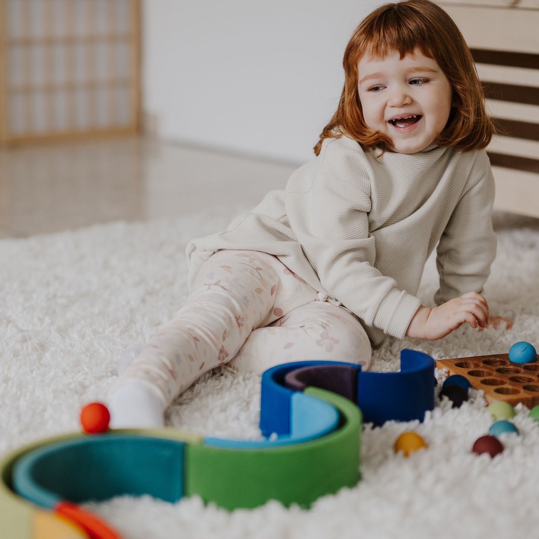 Parents' tip: To encourage free play, we recommend that you do not place the assembled Rainbow for play, but instead tip the individual arches wildly into a basket. This way, the pieces are seen more as building material and the image of the assembled rainbow does not impact the imagination for all the other play and building possibilities.