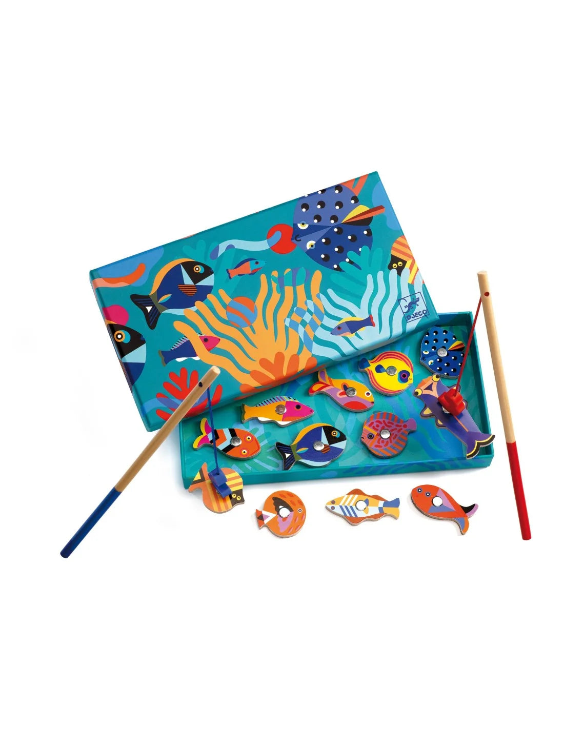 Get ready for a fun fishing game! This set includes wooden fish, two fishing rods, and a decorative box that transforms into a seabed scene. Kids use the magnetic rods to catch the fish—and let the fishing fun begin!