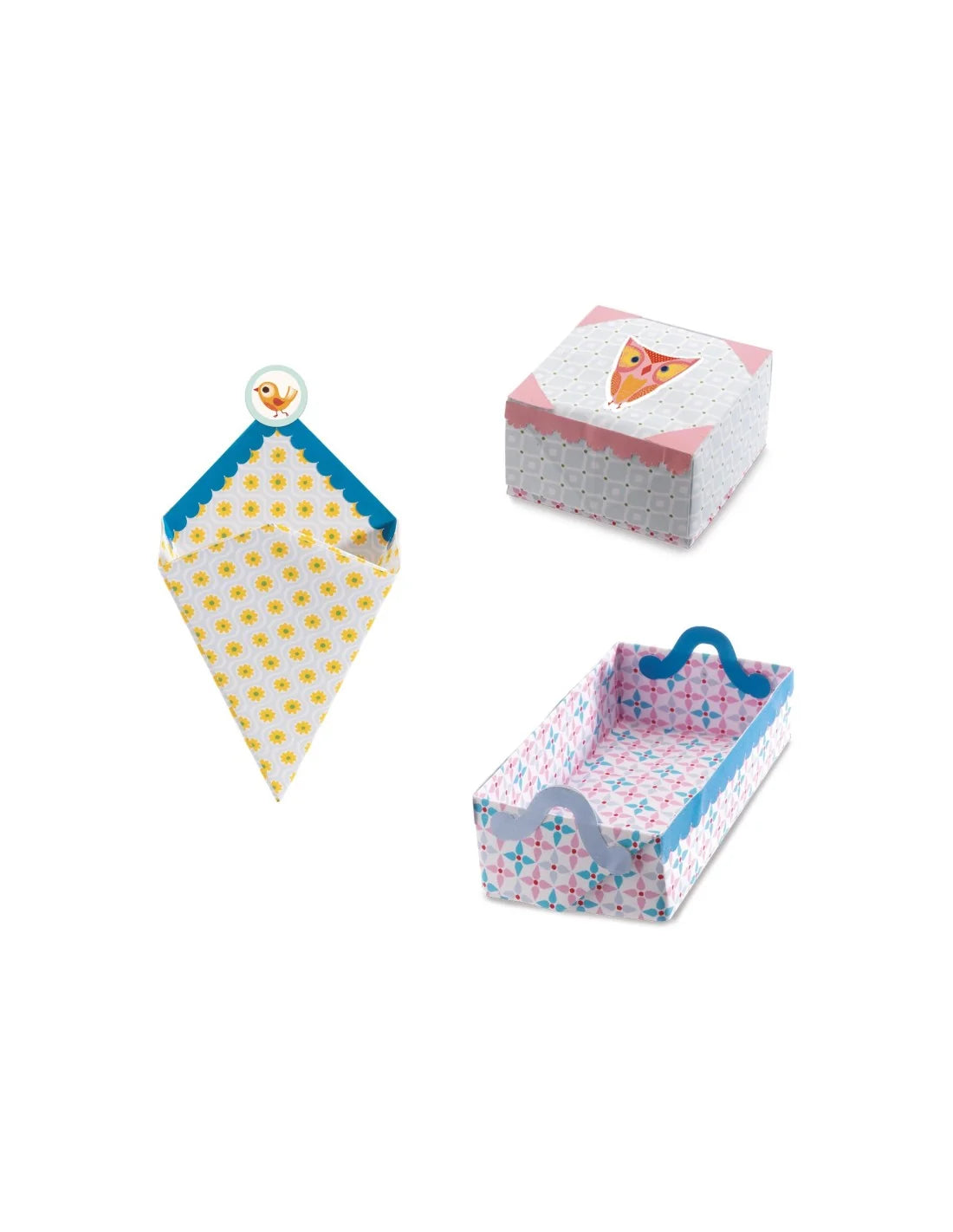An origami booklet with paper featuring trendy and refined prints to create and decorate 24 small boxes.