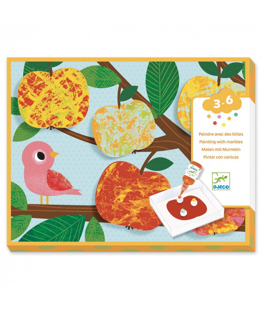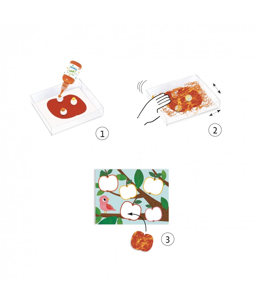 An original activity: painting with beads to make beautiful cards. The children place a silhouette of an animal in the transparent box, add the beads and put large drops of paint on it. The children close the box and shake it energetically... When the box opens, surprise! The silhouettes are colored and covered with traces of paint. Now the children only have to glue them on the coloring pages.