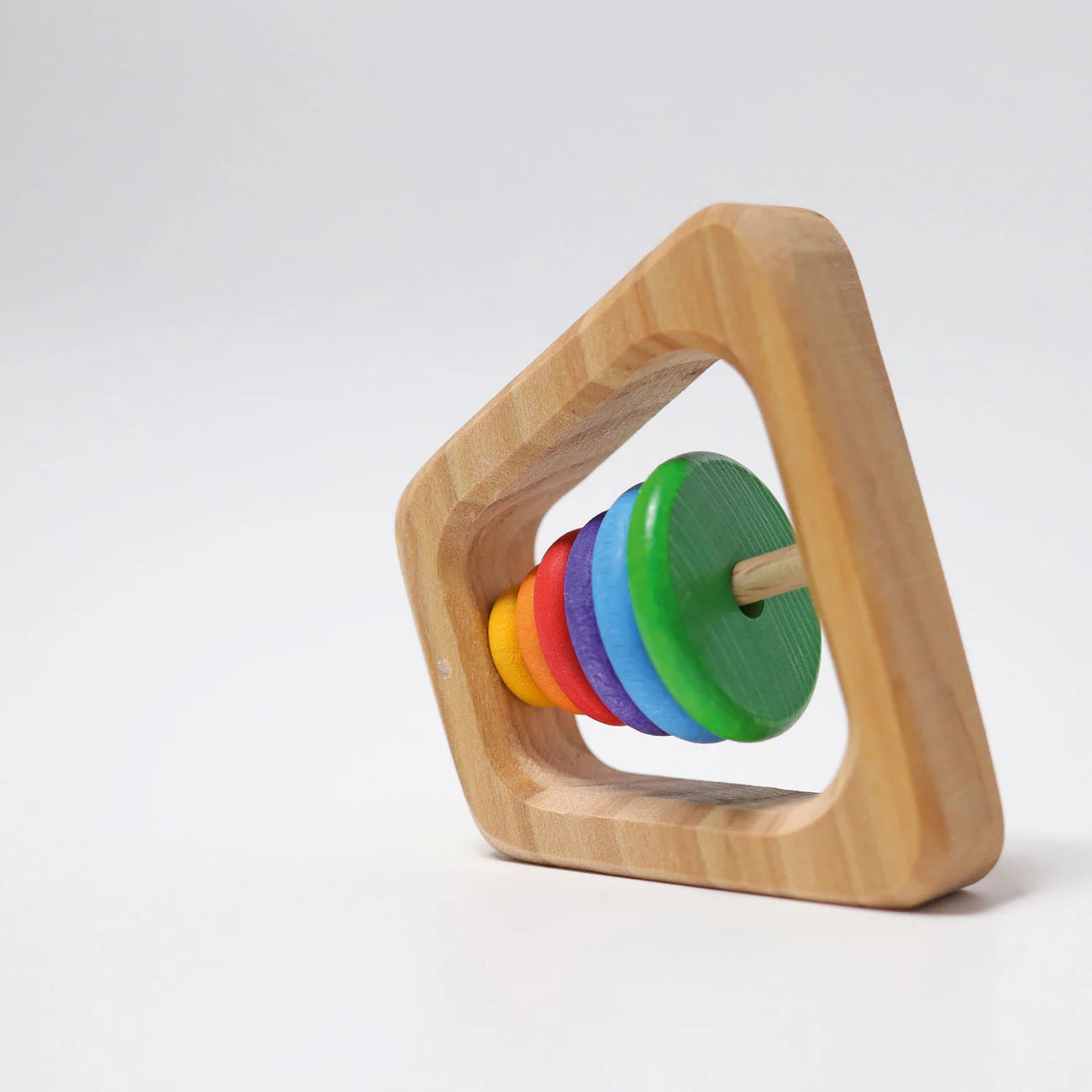 Rattle or teething ring with six rainbow coloured wooden discs.