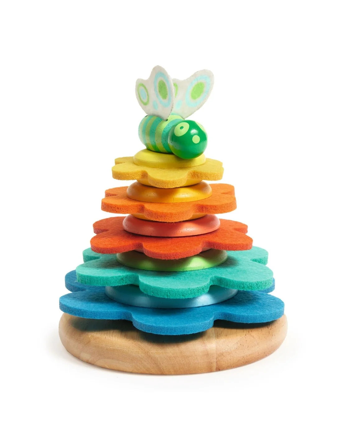 The child stacks the discs in order from largest to smallest and adds the butterfly on top to complete the pyramid. A fun surprise awaits underneath the biggest ring!