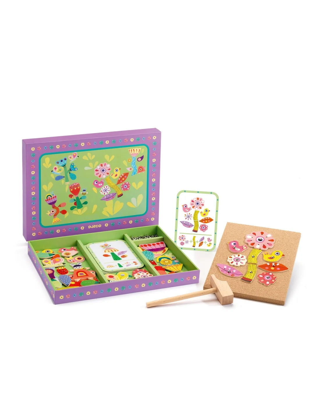 Tap Tap Garden: a classic preschool activity reimagined by Djeco to develop young children’s dexterity. Your child builds their own flowers and gardens by placing the pieces on the cork base and securing them with the small nails and hammer. They can follow the models provided or use their imagination to create a beautiful garden — all neatly stored in a lovely wooden box!