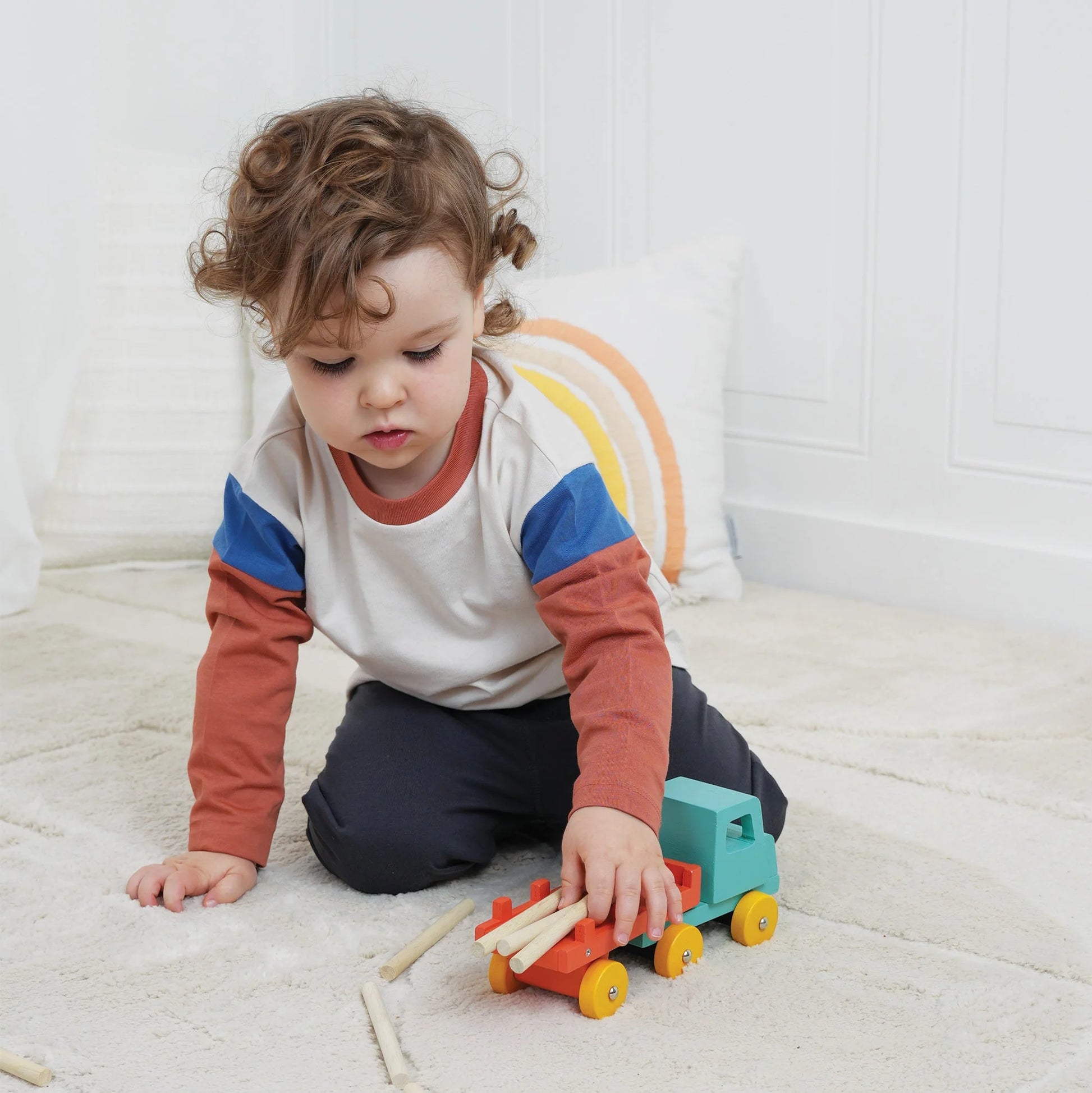 Based on a retro design, the simple clean lines give this traditional toy a refreshing look and feel. A classic big green blue timber truck with yellow wheels and 7 wooden rods to transport.
