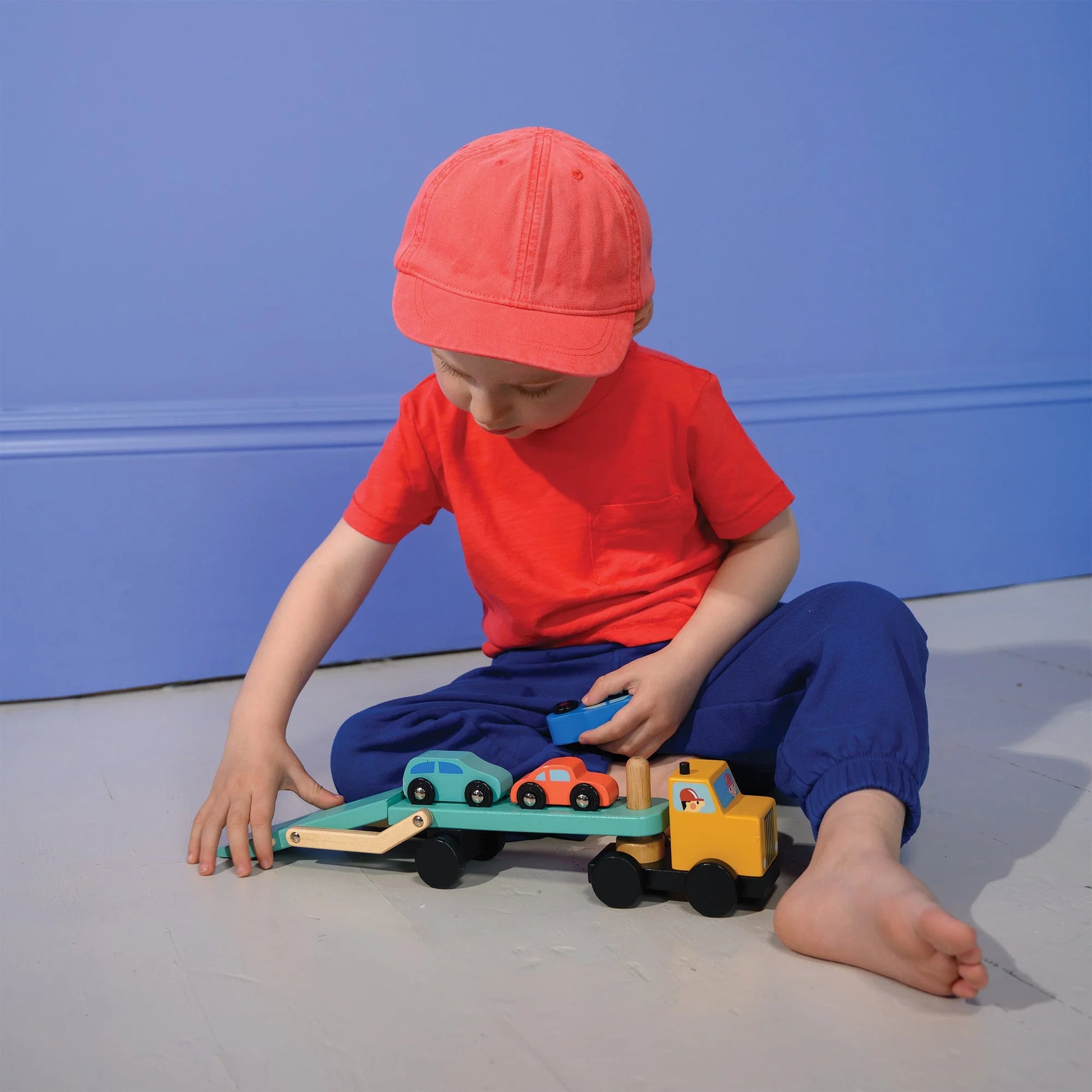 This car transporter vehicle toy has 3 different coloured cars. The top level can be moved to a flat position with a movable arm.