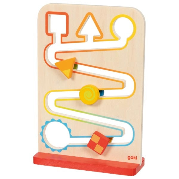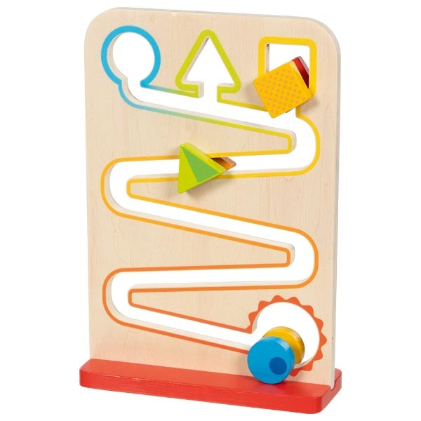 Your child can easily grasp the different shapes and watch them roll down the curved track.